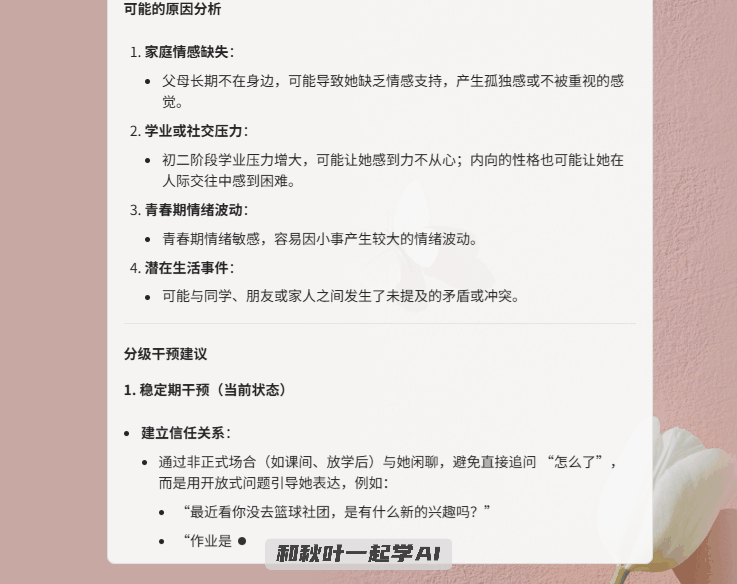 秋叶研发部拉小登教员研发的高校课程设想智能帮手,若是你是高职高校教员,帮帮教员从度关怀学生的心理健康,给出分级干涉方案,讲堂互动性不高?AI 生成了「1个通俗+5种新的思」,霎时变得像故事一样好懂,别怕!辞别加班!